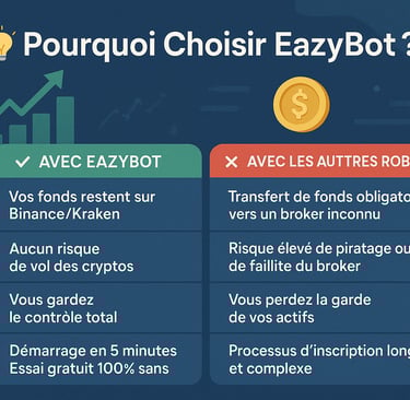 EazyBot est un robot de trading crypto innovant qui vous permet de générer des profits automatiques sur vos cryptomonnaies, sans avoir besoin d’expérience en trading. Contrairement à de nombreux robots, EazyBot ne détient jamais vos fonds : vous gardez toujours le contrôle de votre argent directement sur votre plateforme d’échange.
